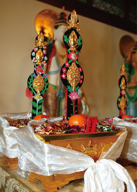 「迎春盆」是藏族賀年傳統之一。藏語稱為「切瑪」,原本在彩繪的木盒內盛裝穀物,插上青稞穗和酥油花,象徵五穀豐登,吉祥圓滿。噶居寺加以改良,用檜木製作容器,雕刻八吉祥圖騰、箔金裝飾,裡面鋪滿紅高樑和糖果,再裝飾金花或象徵金吉利的橘子等,以及喇嘛巧手捏製的酥油花,並繫上白色卡達。
