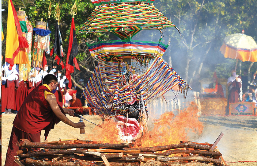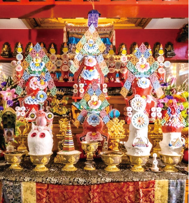 火供圓滿,眾人追隨 上師晉殿,以牛奶上供下施灑淨己身,以青稞粉末供養三寶,而後自嚐些許,象徵來年諸事吉祥。