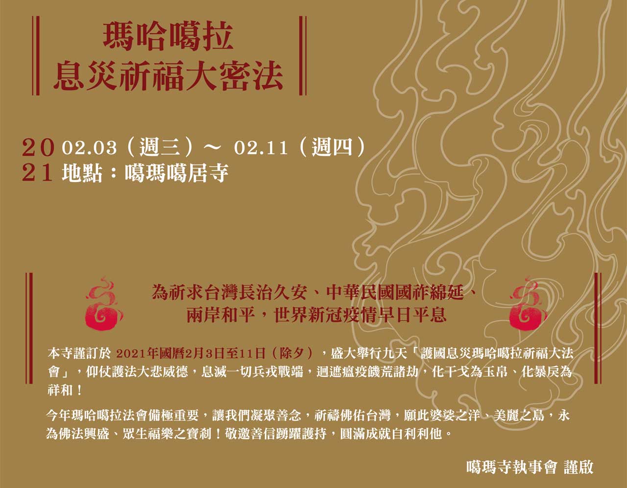 為祈求台灣長治久安、中華民國國祚綿延、兩岸和平,世界新冠疫情早日平息,本寺謹訂於2021年國曆2月3日至11日(除夕),盛大舉行九天「護國息災瑪哈噶拉祈福大法會」,仰仗護法大悲威德,息滅一切兵戎戰端,迴遮瘟疫饑荒諸劫,化干戈為玉帛、化暴戾為祥和!