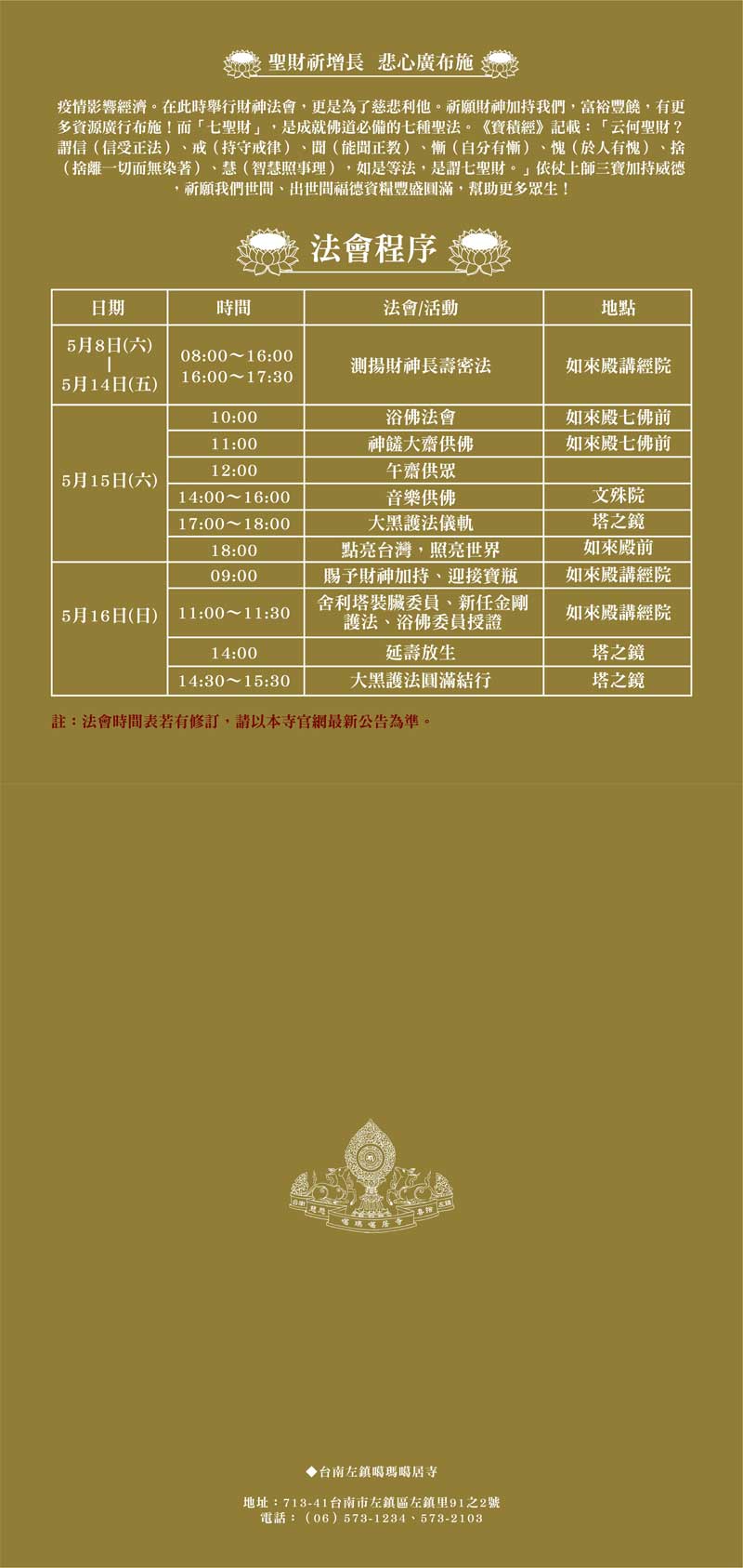 本寺謹訂於110年國曆5月8日~16日舉行財神寶瓶法會,5月15日浴佛。恭請尊貴的赤巴 第三世洛本天津仁波切主法,為蒼生祈福。