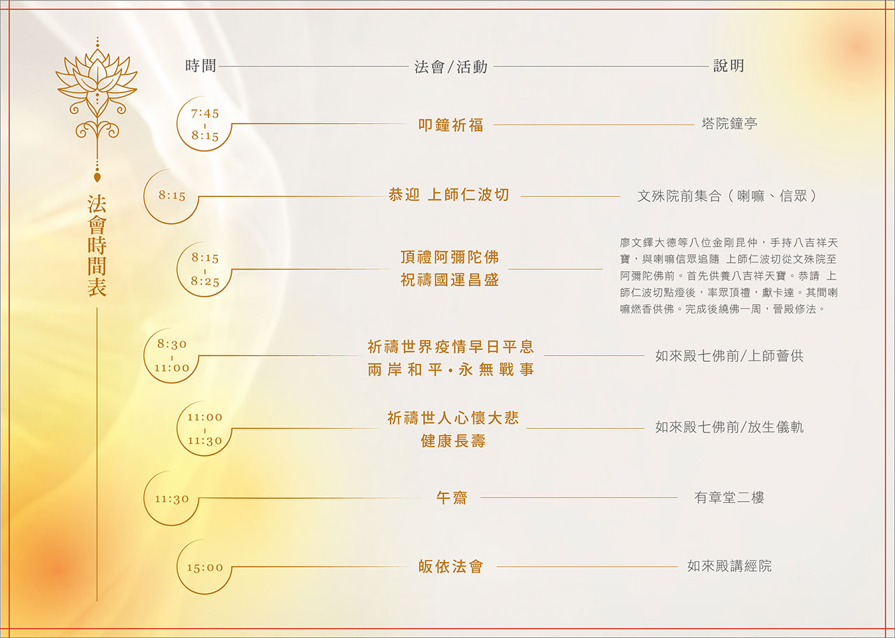 上師仁波切如是說:「元旦供佛是我寺極為重視的法會之一。新年伊始,以供養十方諸佛菩薩之莊嚴盛事,祈求三世諸佛放大光明,普照諸有情,消弭世界兵戎、瘟疫、饑饉等劫難,功德迴向眾生安樂、四海昇平。時值跨年觀音齋戒圓滿日,象徵持守戒律清淨,增長善業功德、廣積成佛資糧。祈願成為我寺美善傳統,未來佛子永續恪遵奉行。」敬邀十方法友踴躍護持,蒞臨禮佛,凝聚善念,為國祈福――台海和平、永無戰事!