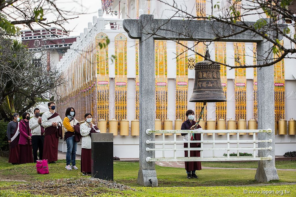 在觀音齋戒出關日,法友信眾接力叩鐘祈福。本寺梵鐘,刻有觀音六字真言與般若心經。梵鐘迴盪之際,地獄、餓鬼、畜生可一時解脫痛苦。願此鐘聲超法界,鐵圍幽暗悉皆聞;聞塵清淨證圓通,一切眾生成正覺!