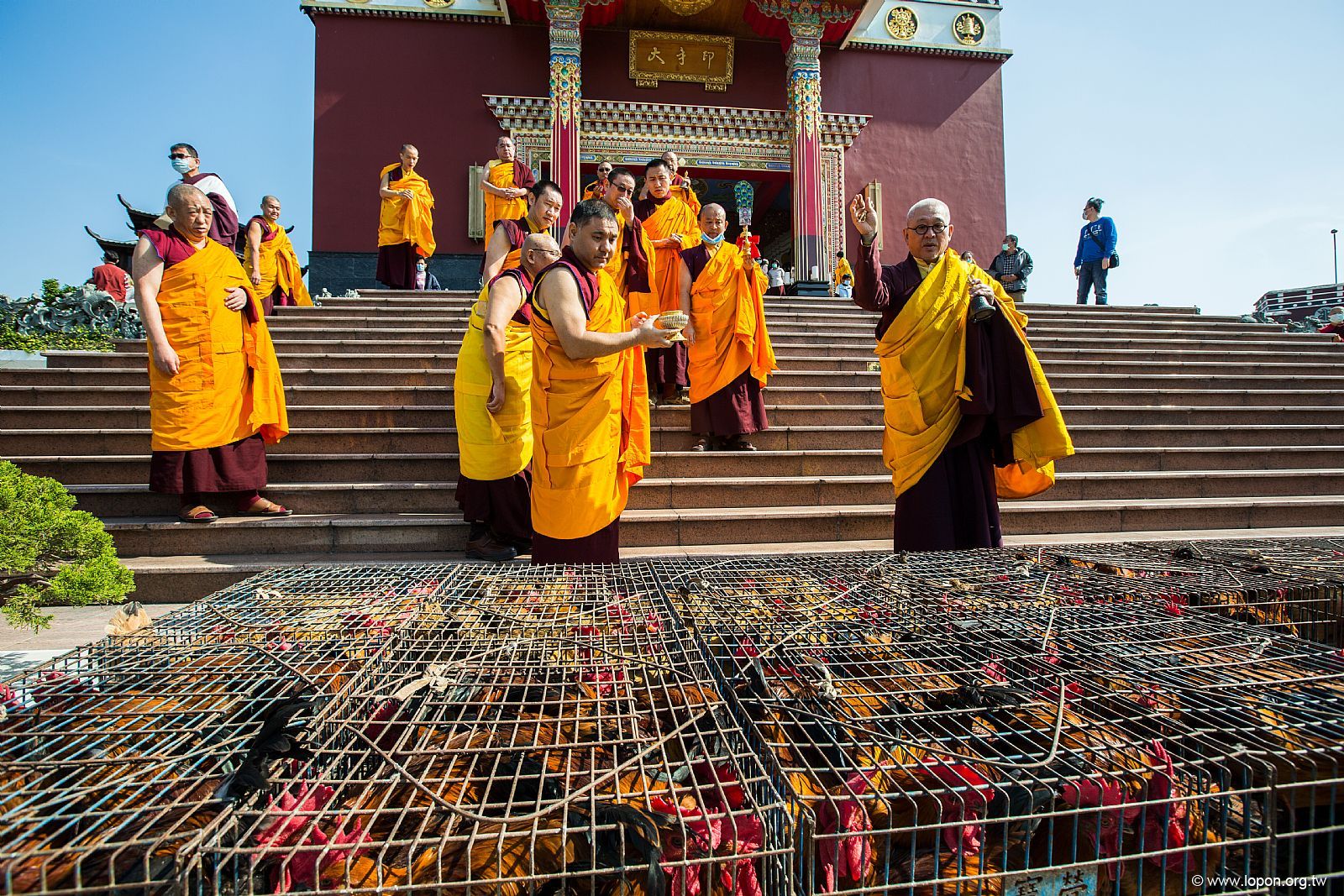 上師仁波切如是說:「體弱多病或身染惡疾者,放生是消除惡業最速方便。健康者放生,則是增長慈悲心的功德事業。我寺對外主道,幾攤甕仔雞、燒烤鷄,殺業甚重。本寺放生前,不預購,不挑選,整籠雞全買。若挑選,未能平等救護,則同時種下善惡因。修法為雞隻加持、授予皈依後,安置於農場養護照料,直至命終。相信牠們此生得聞經法、親嚐甘露,來世必然解脫畜生道,定能發願再來護持佛法。善的循環,生生不息。祝福大家!」