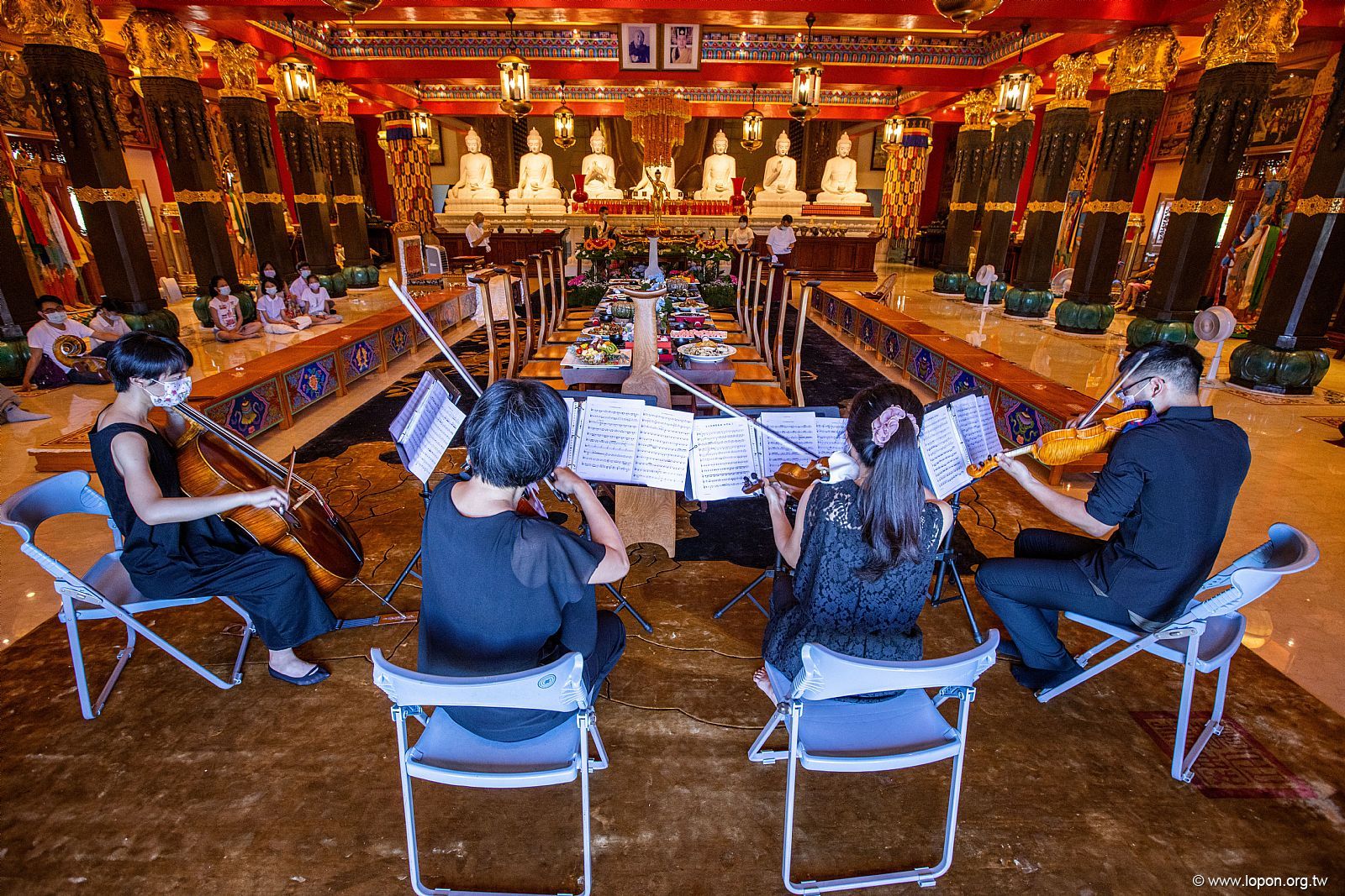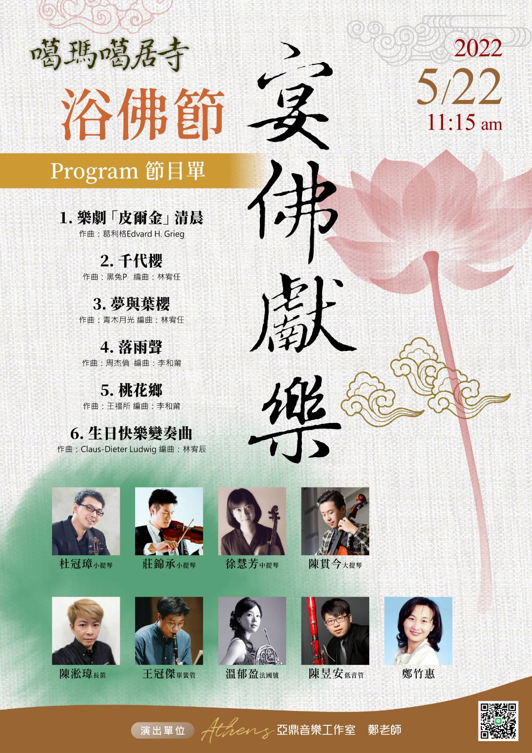 * 宴佛獻樂。沐浴佛身後,恭誦聖三蘊經。宴佛上供,妙音響起,全體僧俗沐浴在浴佛獻供美樂境界,心中湧現無量虔誠信念,猶如恆河水,注入法身大海中。歡度佛誕慶生,增長福慧二資糧。歡迎十方大德隨喜供養佛宴與佛樂!