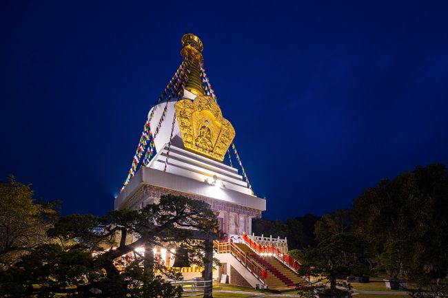 台灣罕見藏式佛塔。屬於佛陀八相成道塔之菩提聖塔。尊稱見即解脫吉祥光塔。藏式佛塔極為講究,地上一層為塔基,二層以上為塔體。五層塔上是十三層塔尖與日月輪與滿願寶。一般西藏佛塔為二層樓高,不設窗戶,完全密封。噶瑪寺佛塔屬於塔中廟,半開放式,三樓以上密封...