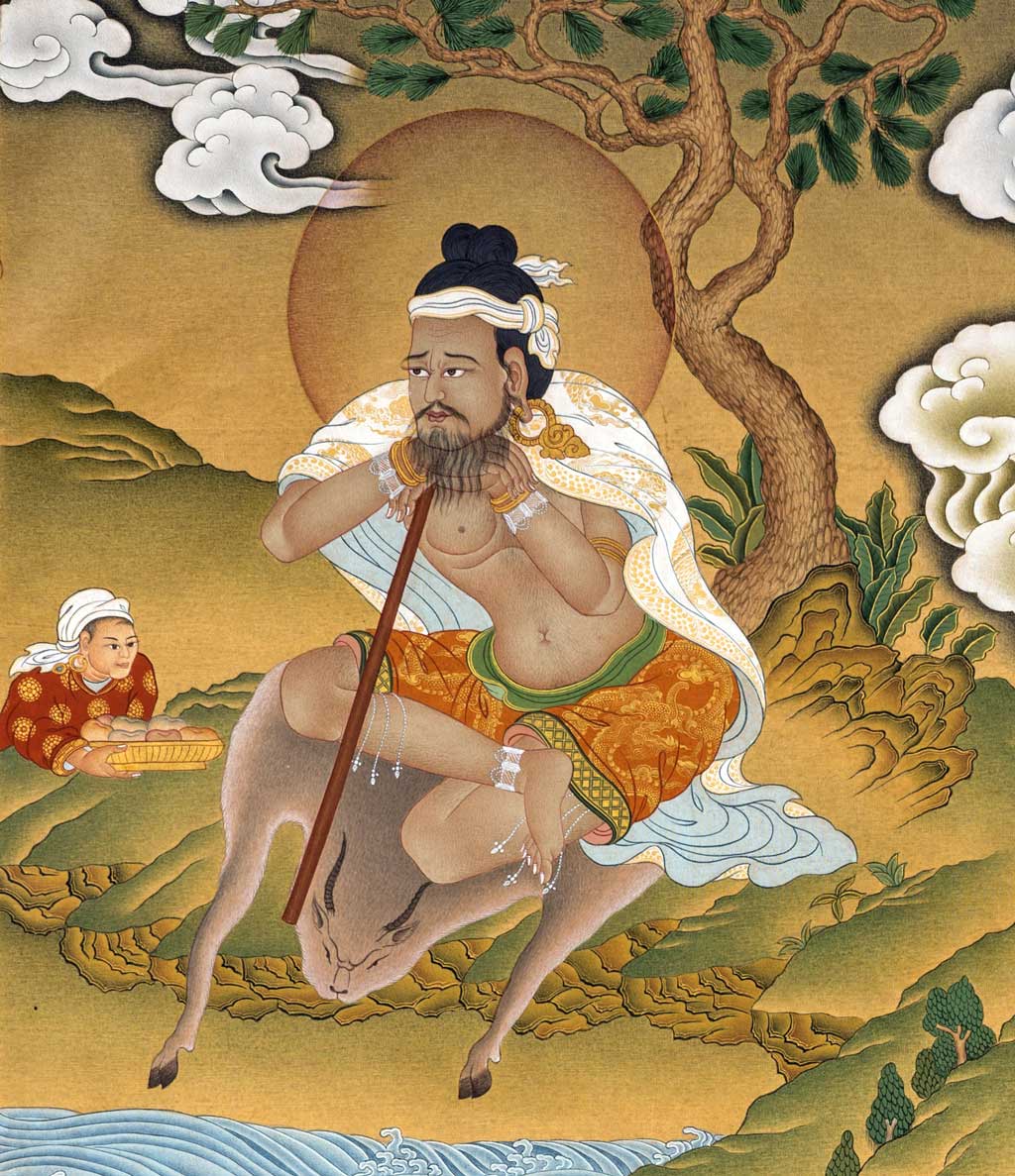 傷心的拿古納,獨自離開家,走進城郊的森林,躺在一棵樹下,望著樹葉縫間的陽光,靜靜地發呆。一位尊貴的瑜珈士剛好經過樹前,看見躺在樹下的拿古納,張大了口,一副餓得發慌的樣子,就對他說:「看你餓得那麼難過,我們一起到城裡去乞求點食物吧!」懶惰的拿古納卻回答說:「如果我們辛苦的乞食,卻什麼都沒得到的話,那不是白費工夫嗎?所以我不想去!」瑜珈士充滿懷疑的問說:「你連乞食都懶得做,難道你毫無任何特點嗎?」拿古納回答說:「尊貴的瑜珈士,請您想一想,如果一個人被命名為拿古納,那他還能擁有什麼好的特點呢?」拿古納閤著眼睛躺在樹下,任由肚子咕嚕咕嚕叫,連動都不肯動一下。瑜珈士搖搖頭,離開樹下走進城裏乞求食物,當瑜珈士乞食後,帶回森林中,準備享用時,看見拿古納餓得臉色發白,全身癱在地上,發出哀求的聲音。瑜珈士心中生起了慈悲,便將乞求來的食物分一半給他。看見拿古納將食物一口一口吞嚥下去,瑜珈士問說:「你害怕死亡嗎?」拿古納回答說:「事實上,我非常害怕,但是我又不知道該如何面對它。」瑜珈士接著說:「如果你願意修持的話,我可以將超越死亡的珍貴佛法傳授給你。」拿古納說:「珍貴的瑜珈士,我非常感謝您願意教導我,但是祈求您的教法,能夠讓我利用睡覺的時間來修持。」於是,瑜珈士就給予他珍貴的灌頂。並教導他結合空性和顯現的教法: