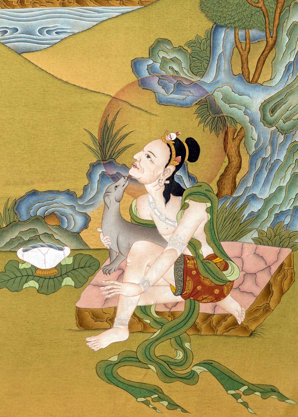 從前,有個來自卡比拉薩故鹿的婆羅門人對密乘生起信心,於是他便修持瑜珈行,並以化緣乞得所需。某天,在往倫比尼城的路上,他碰到一隻快餓死的母狗,便生起慈悲心,將牠帶往城裡。四處尋找之下,找到一個空山洞,便決定在那兒修持,當他外出乞食時,就將狗留在山洞裡。