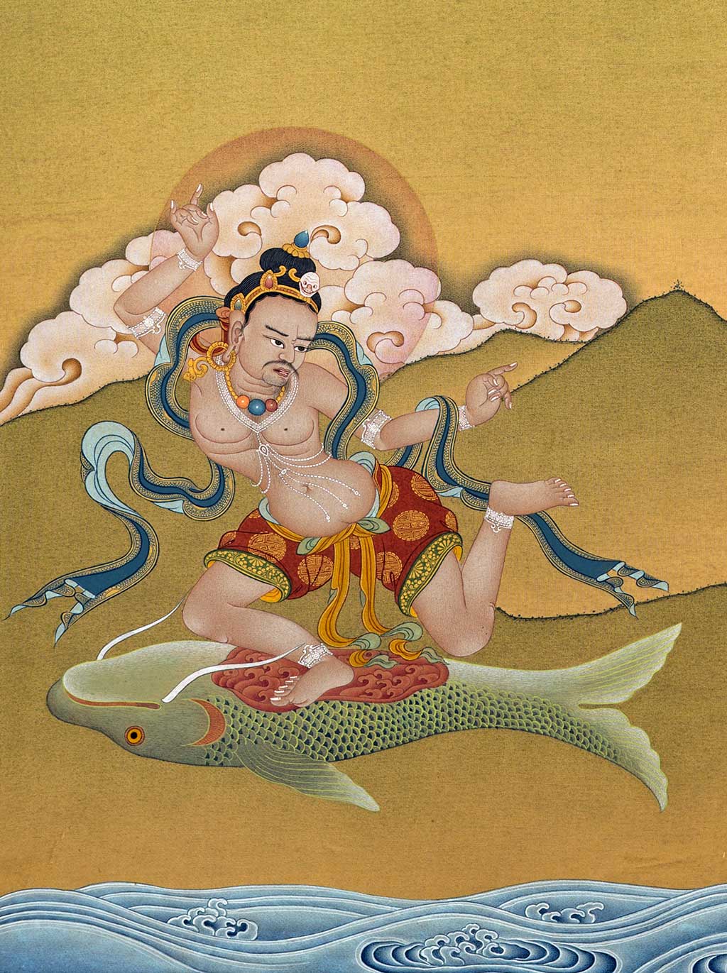 密納巴尊者出生於東印度首陀羅族的漁民之家,他的上師是大梵天王,而他所證悟的是世間的成就。當密納巴還是漁夫時,他每天在噶瑪魯巴一個叫做伊塔的海洋裡捕魚,因為這個海邊有一個很大的漁市湯,在這裏很容易將漁獲賣掉。有一天,密納巴把棉線綁在釣鉤上,鉤上以肉為餌,拋入海中。很快的,一條大魚上了鉤,可是大魚在海裡翻騰,竟把漁夫密納巴拖到海裡去。大魚一口就把密納巴吞下肚,但是由於密納巴福緣未絕,反而在魚腹中存活下來,與大魚共生。