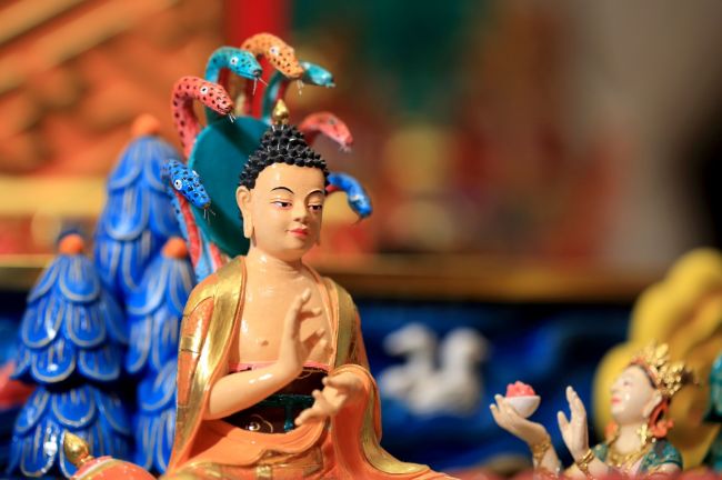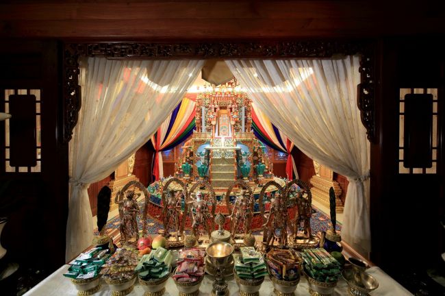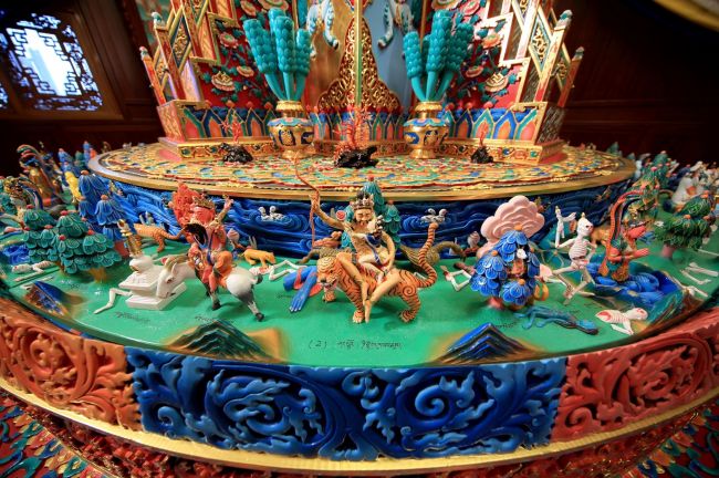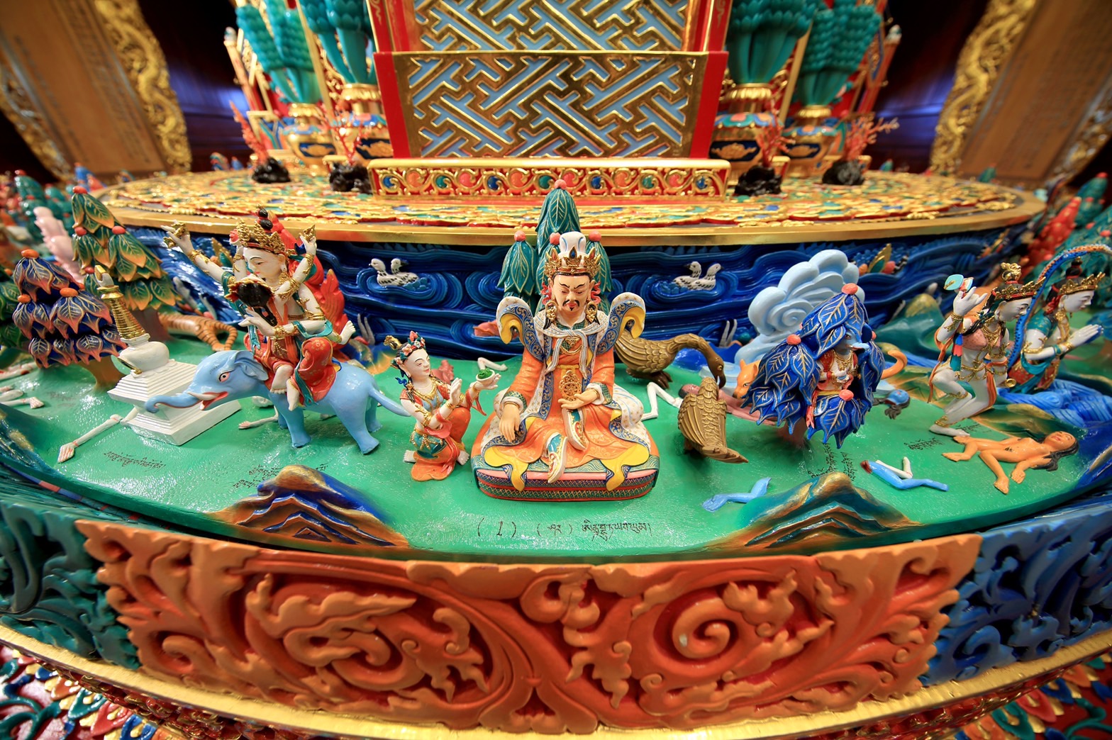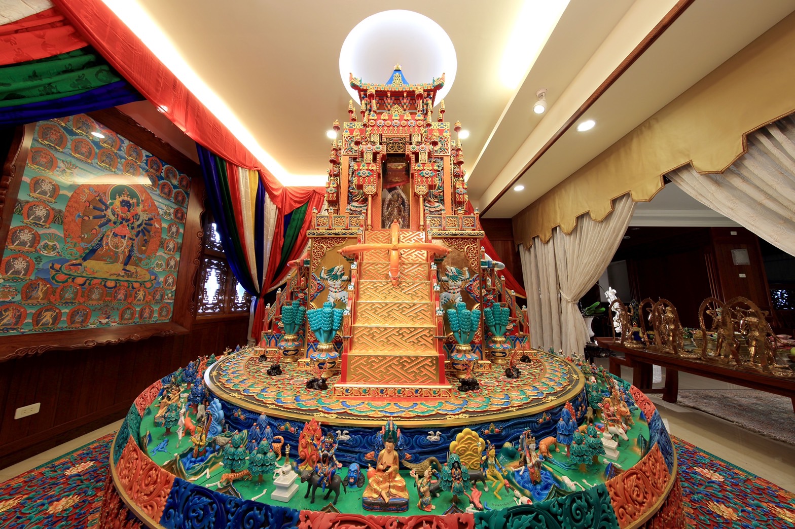 完整的上樂金剛壇城,呈現在如來殿最上層,說法世尊頭頂之上。以肖楠木雕刻彩繪。壇城按法本所釋,外圍的尺寸規範造型莊嚴,壇城內的主尊、眷屬、門衛一應俱全,皆以純銀鑄造裝臟圓滿,不是空的壇城。壇城最頂層則是多傑姜雙運身。由外無法一一仰視清晰,於是在外面懸掛所有本尊照片。登上如來殿欲頂禮者,切莫空手,整裝儀容準備卡達供養物,任何心悅吉祥如鮮花、水果、鈔票、金銀首飾、沈香等等,將所攜帶放置一旁桌上,頂禮後獻供,領受加持。在壇城前禪修片刻,或誦祈禱文發願文,功德無量倍增。離開時雙手合十恭敬告假後退數步再轉身離開,勿需再頂禮。如此 甚深內行對淨化身心具有極大助益。