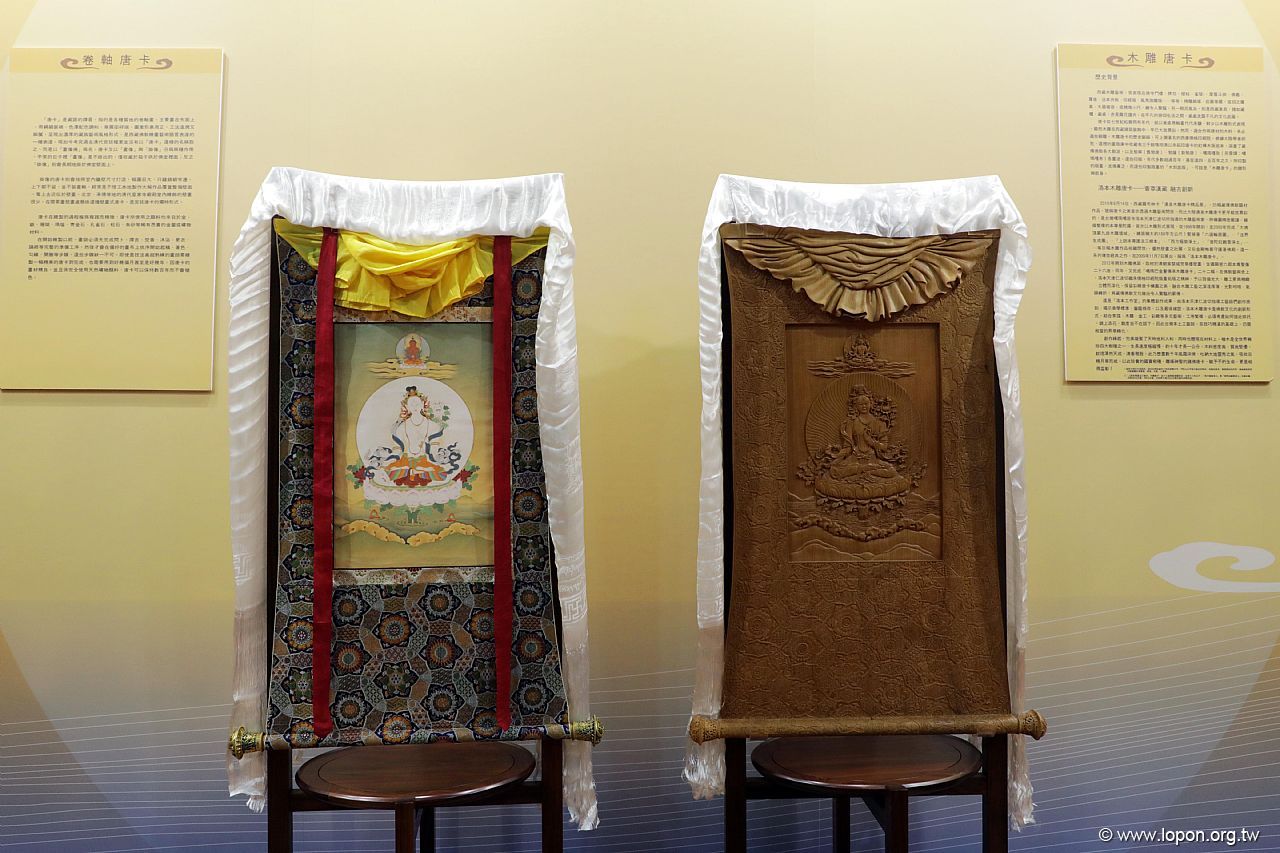 在古董唐卡後兩側是白度母唐卡與白度母木雕,正是這次展出的木雕佛屏中的唯一對照品。