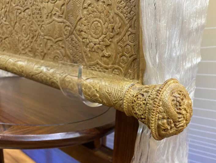 對照另一邊的木雕白度母,精雕細琢簡直是苛求,幾近完美。連最上的布面捲起繫於繩上,都刻畫如此貼近。襯布圖案一刀一鑿,美不勝收。帽桿與兩頭銀鎏金裝飾更是不得了的精湛。這幅木雕唯一美中不足的是最上方的布條,由於原物件布條太細,雕刻中一個呼吸就可能折斷的考量下,改以雙股草繩替代。雖說不完整,卻也展現另一種風格。