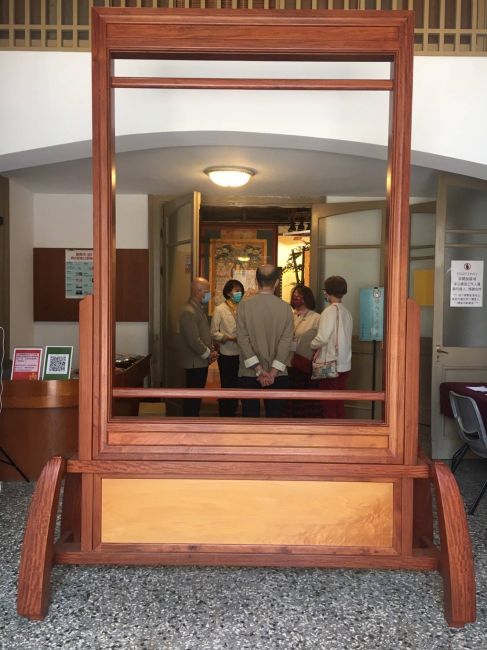一進入展場,就會看到一幅只有框,沒有雕刻物的檜木屏風,跟裡面的木雕一樣有花梨木底座。為什麼放一幅空白的屏風呢?