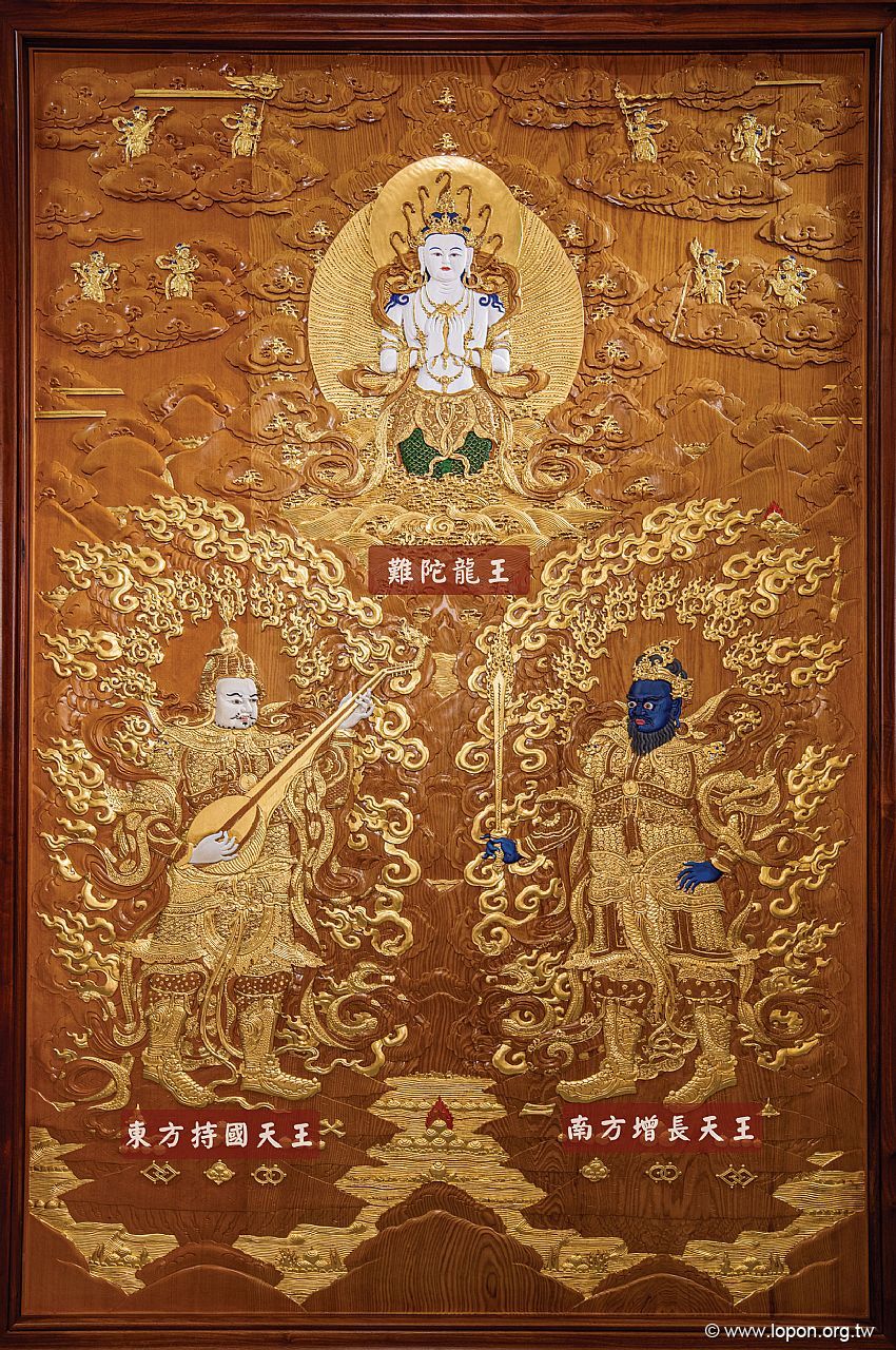 「大乘般若經品」三位護法:東方持國天王、南方增長天王與難陀龍王。