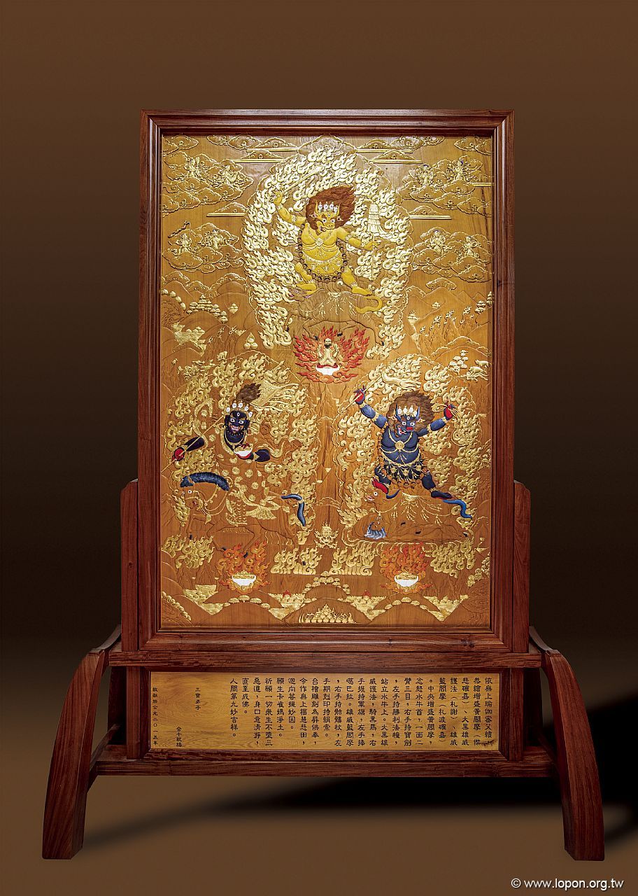 中央增盛黃閻摩,忿怒水牛首,一面二臂三目,右手持寶劍,左手持勝利法幢,站立水牛上。大黑雄威護法,騎黑馬,右手握持軍旗,左手捧噶巴拉。雄威藍閻摩, 右手持骷髏杖,左手期克印持羂索。