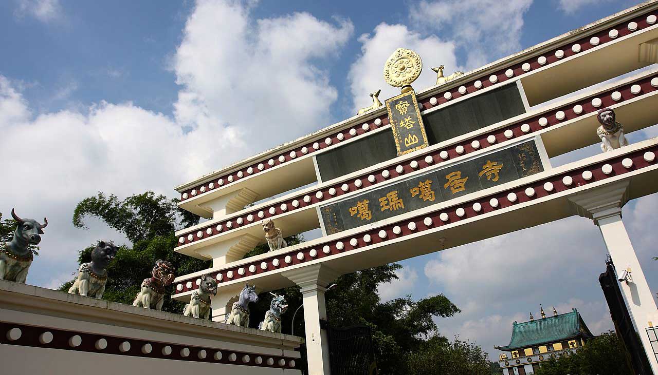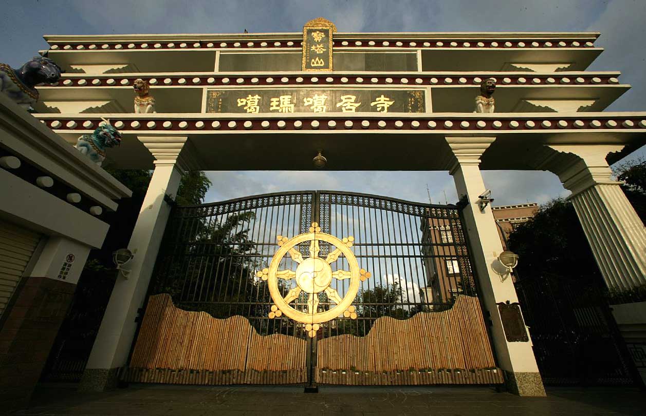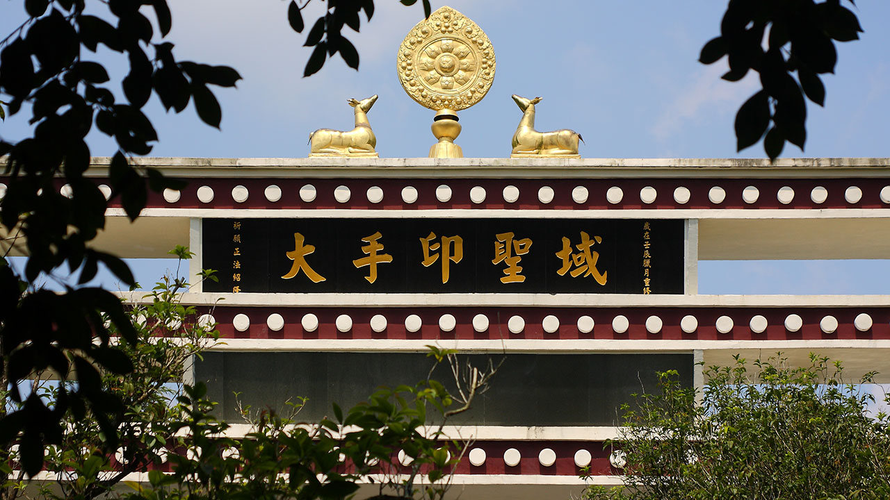 噶瑪噶居寺山門大氣雍容,是朝聖的起點,轉心向道的開始。這座牌坊式建築,以三層平台的結構,代表佛教三乘法門:小乘、大乘、金剛乘。