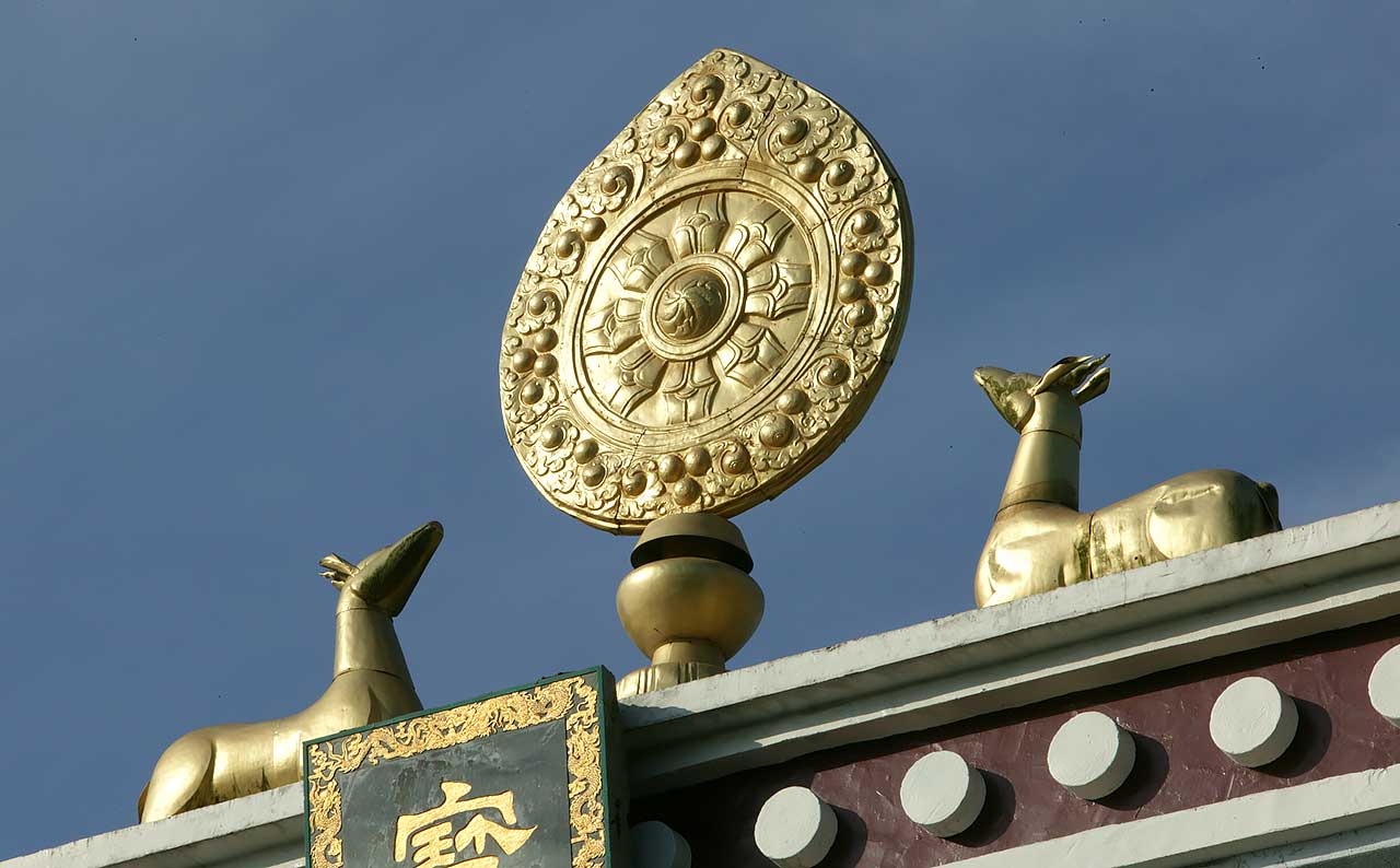 往上看頂端有金色八輻法輪,安立於蓮花寶瓶上,象徵佛陀身、口、意。法輪兩側有雌雄雙鹿,雙鹿象徵弟子隨佛聞法修學,法輪象徵佛陀常轉法輪。釋迦牟尼佛成道之後,梵天敬獻千輻金輪,帝釋供養右旋海螺,再三祈求佛陀說法。此時,森林裡來了一對雌雄雙鹿,直望著金法輪。依此因緣,佛陀將法輪譬喻為八正道,雙鹿譬喻為所化之男女弟子。此後,「法輪雙鹿」(或稱「祥麟法輪」)不但是佛陀於鹿野苑初轉法輪的紀念標誌,也成了藏傳佛教寺院最具代表性的徽記。