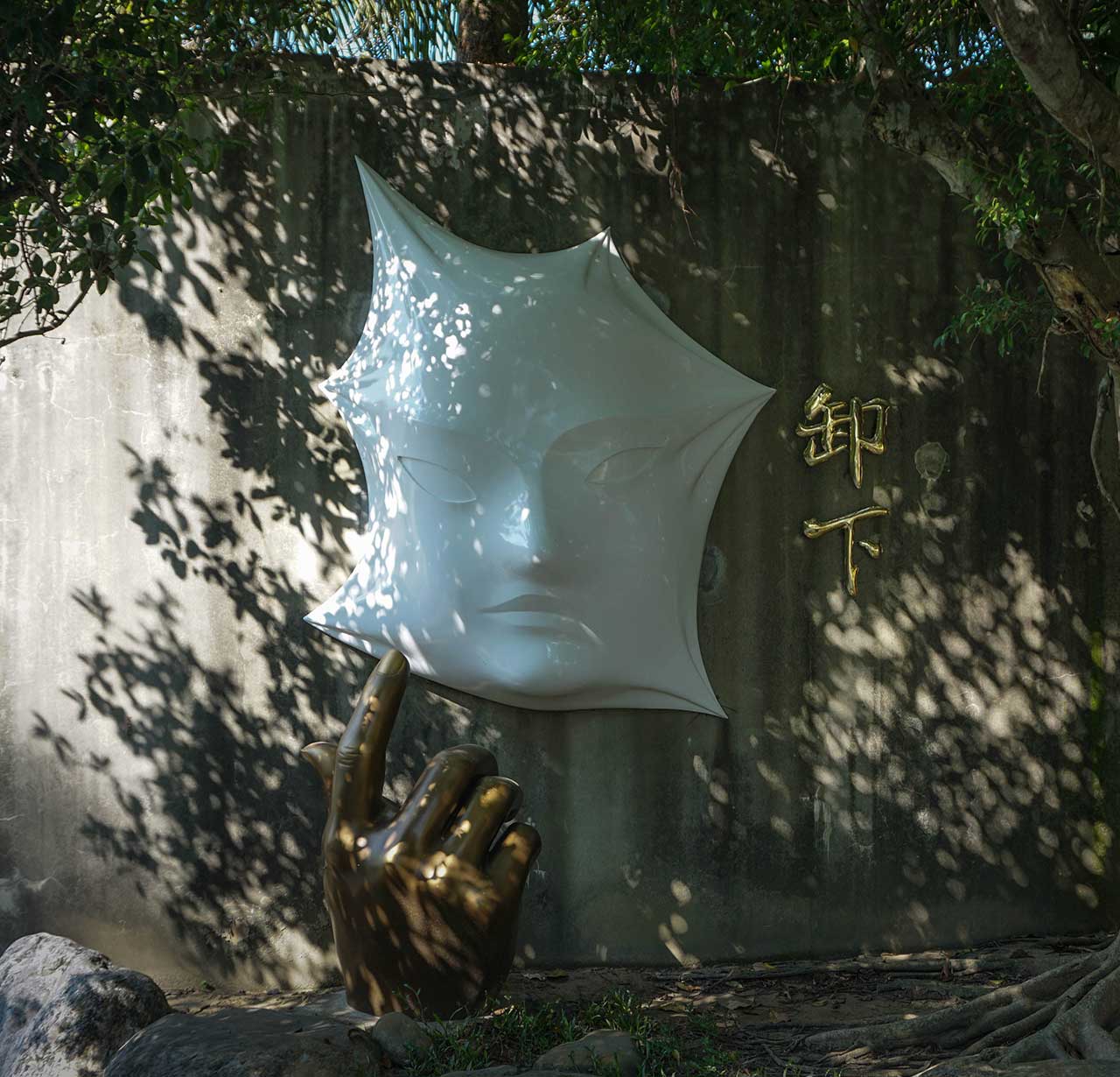 進入山門首見「卸下」面具裝置藝術。門外六道所有紛擾,入此門時當卸下偽裝的面具,步入成佛之道桂花樹林,進入佛國淨土。
