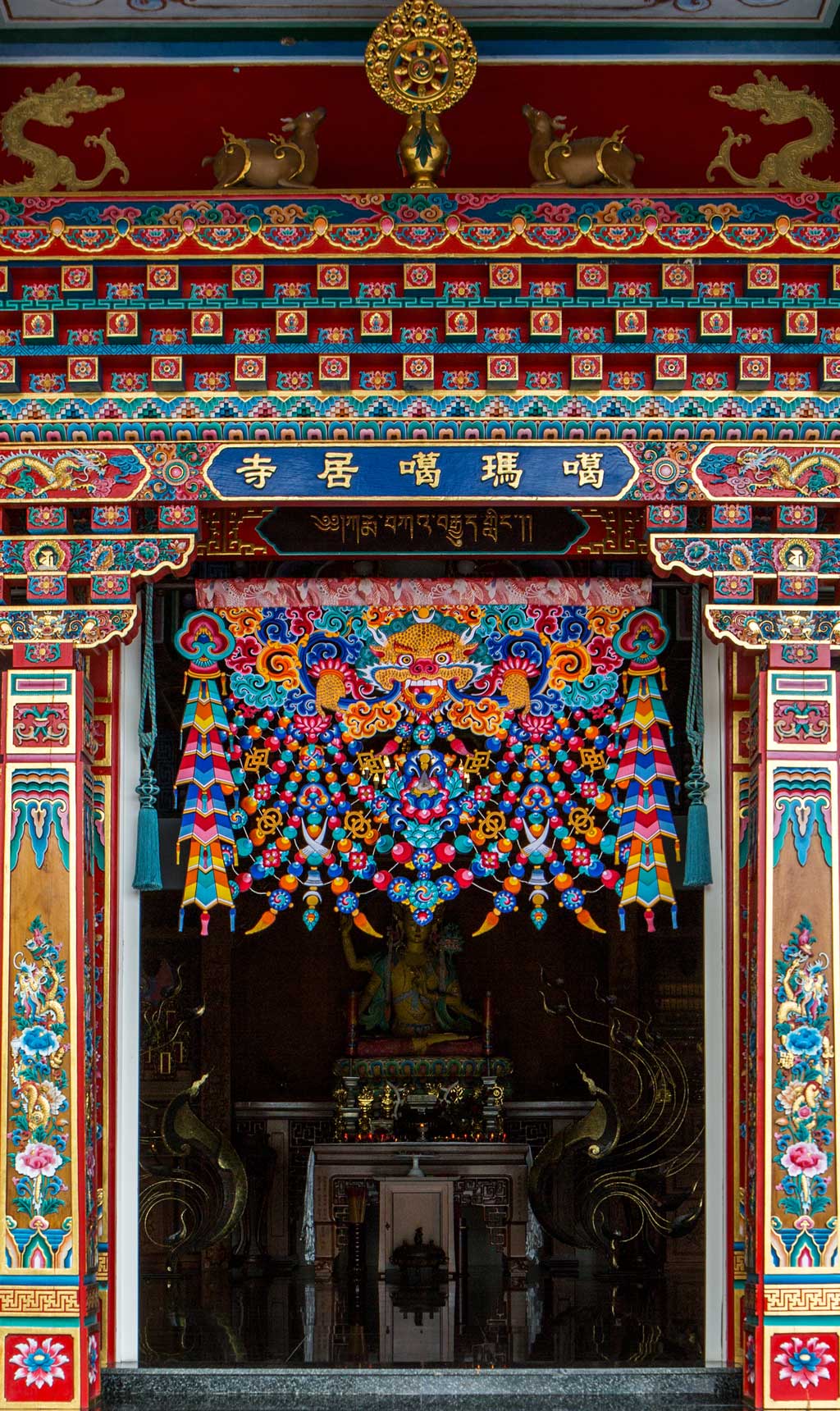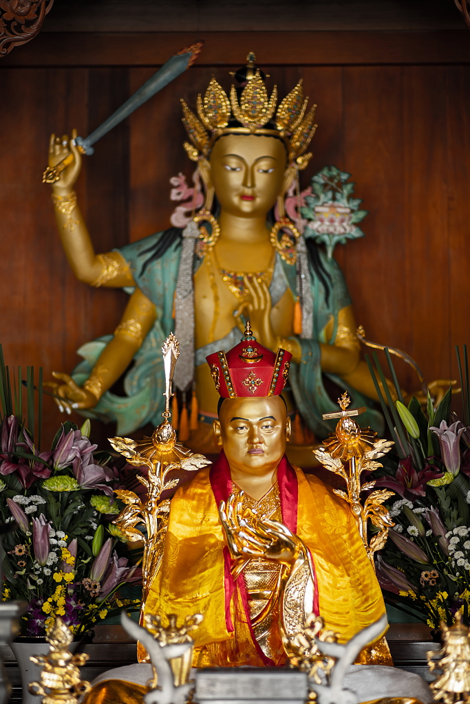 進入門簾供奉主尊四臂文殊師利,右手持劍、左手持蓮花,花上般若經典。另外一對右手持劍,左手持弓是一切文殊成就總集。右手持劍及箭,象徵斬斷一切煩惱,是中道;箭隱喻智慧。左手持蓮花經典及弓,象徵斷一切所知,是寂靜;弓象徵聚集生死能量之方便。文殊菩薩被譽為一切菩薩之中,智慧第一。所謂的智慧就像黑暗中的明燈,可以照亮指示正確的道路。