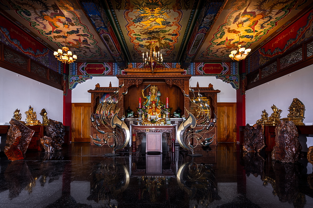 前面案桌供奉傳統的錫爐及燭台,西藏八吉祥:法輪、法螺、法幢、寶瓶、蓮花、雙魚、吉祥結、寶傘。在這裡西藏印度的密法與傳統中華文化的精神交會融合為一。
