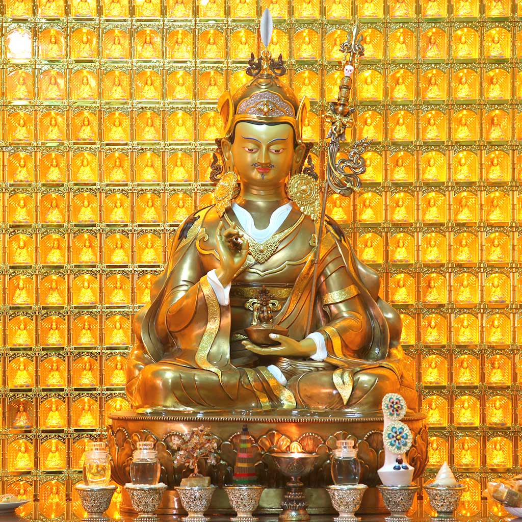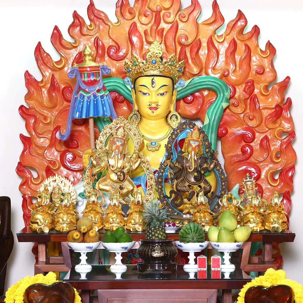 蓮師財神又稱「武財神」,為一切功德、智慧、財富、福祿、名望的根源。供奉財寶天王又稱「毗沙門天王」、「多聞天王」,右手持寶幢,左手抱吐寶鼠,以雪獅為坐騎,火焰背光嚴飾,財寶天王主掌:財富增長。供奉象鼻財神主掌:受用豐盈。