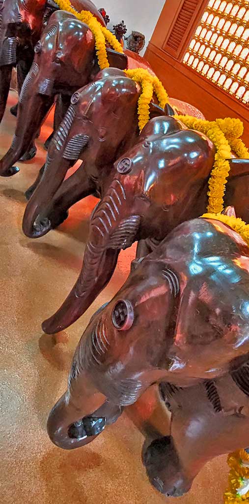 窟內還有許多來自泰國的木雕象,象代表財神,披戴印度風格的黃色花鬘,大大小小造型生動,圓潤可愛。據說,只要選一頭最喜歡的象神,摸摸祂的頭,報上姓名住址,虔誠祈求一個善願,就能美夢成真哩!象神已裝臟開光,具足加持功德。