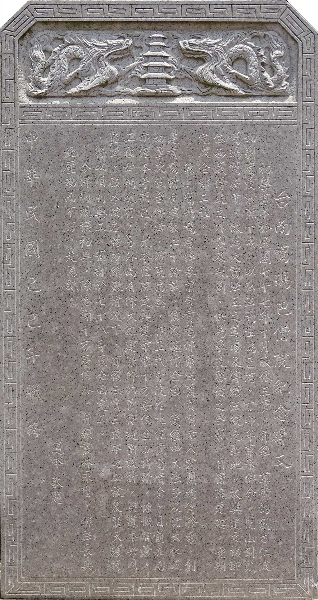 本僧院之興建幸蒙十方善信全力捐輸,慷慨解囊工程如期進行,另外尚有陳大雄建築師的義務規劃設計,與道本共同監造,致本院在物力維艱情況下有賴三寶三根本之加被及龍天護持得以順利興工。今佛剎規模初具,除感謝十方善信外,並願叢林永懋,佛法長興,經塵劫而不朽,是為記。