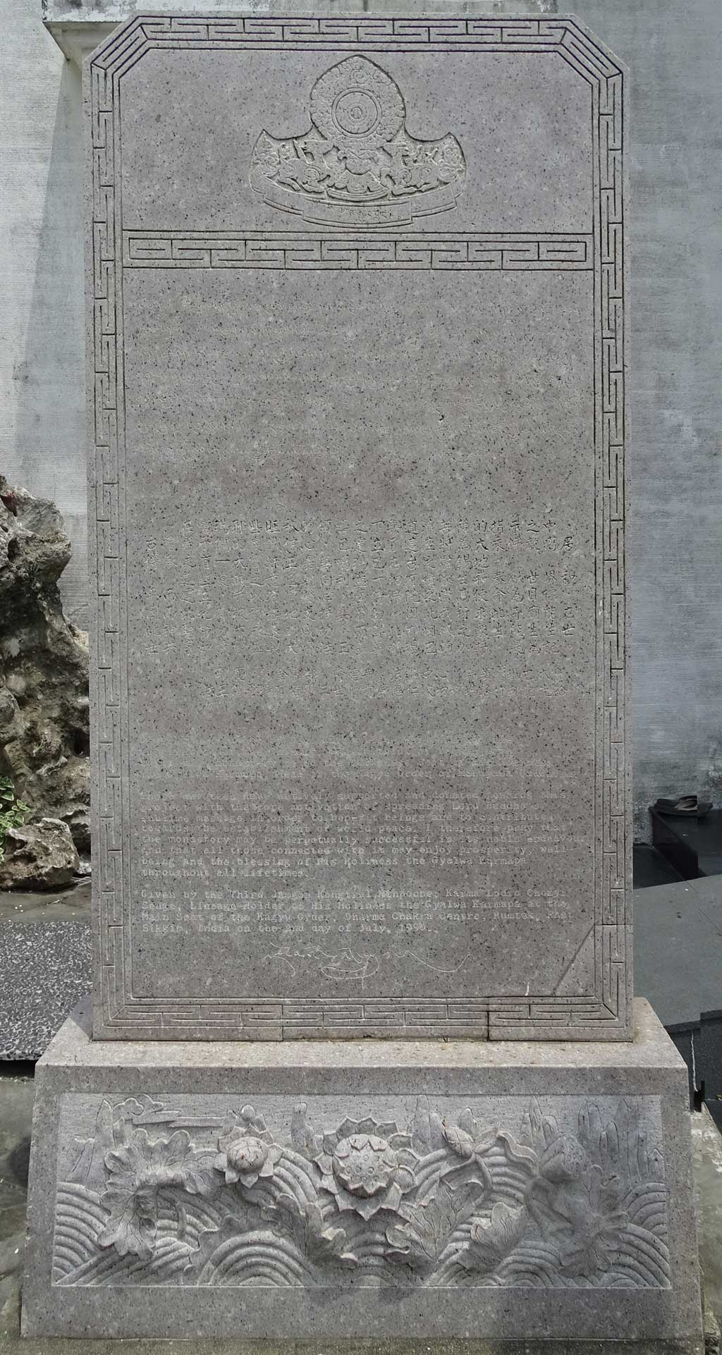 這些虔誠之意已朝向利益一切有情眾生和奉獻世界和平而建立,并以清淨發心,廣傳佛陀之崇高使命為目標。因而此地即被積極地支持與贊助。因此我祈求此寺廟能在此神聖努力下永遠的成功。而與此有因緣之眾生能生生世世共享如意繁盛與大寶法王嘉華噶瑪巴的加持,是為記。