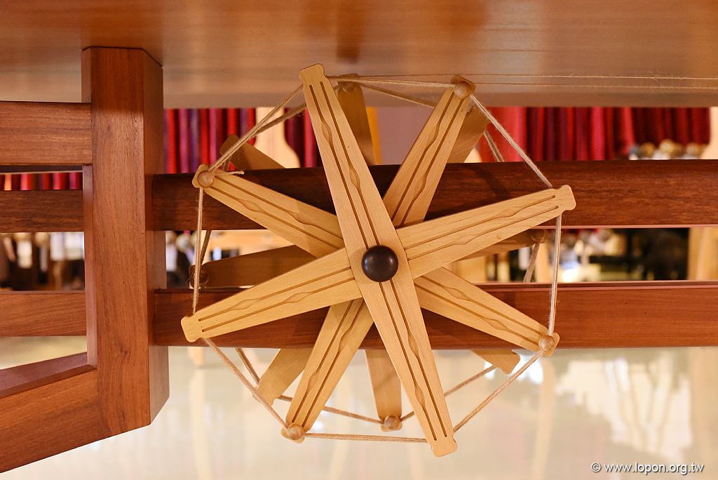 我們居住在大地上。故於長桌下特別設計「紡紗輪」為巧飾,告訴世人不可忘本。先民老祖宗們正是以紡織機,織出錦繡河山、富麗寶島。沒有自由民主、經濟豐饒的國家,就難以弘揚佛法、遑論修行。「紡紗輪」的徽記,提醒我們時時珍惜感恩!而八輻紡紗輪,竟與八輻法輪頗為神似;輪迴昇華為涅槃的過程,當知「佛法在世間,不離世間覺,離世覓菩提,恰如求兔角。」同時也告誡子孫,世間法終究有技窮之時,唯有在佛法庇護中,才能徹底安頓身心。