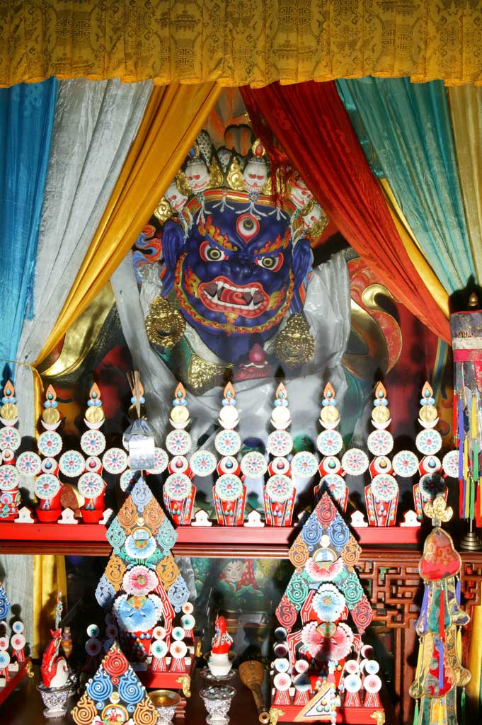 在金剛乘,上師是加持之根,本尊是成就之根,護法是事業之根,第三世蔣貢仁波切曾開示:「護法的功德是幫助你遠離各種修持上的障礙。也能增長你的本能、虔誠心。總之,修行道上我們需要一尊護法,保護我們同時淨化我們的業障。護法在根本上是佛陀的顯化,方便幫助修行者。只要真心虔誠向祂祈求,必能施予加持及清除障礙。」如來殿護法室的瑪哈噶拉聖像,心輪處裝臟一尊隆德寺 夏瑪巴法王所賜,手掌大小的瑪哈噶拉,此尊是建隆德寺時所塑。十分珍貴。如是故,護法室瑪哈噶拉亦尊稱為二尊聖像。