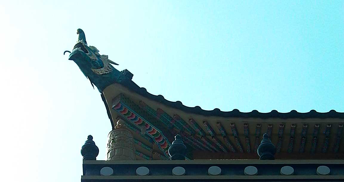 如來殿寺頂四隅莊嚴四神獸。傳說有多義。來自學習中原建築藝術龍的變體而來。其中一說值得關注,鱷魚首頗為傳神。鱷魚是地球古生物活化石,見證一切生命的美麗。同時鱷魚也有緊咬不放之義。佛寺四隅也象徵四事業。以此莊嚴利他無我佛子行。在鱷魚首之下安置,以息増懐誅秘密圖騰所鑄銀版。 在2020瘟疫年之末,我們將舉辦盛大嘛哈噶垃除障祈福法會。同時安放四事業成就牌。為四眾佛子祈福。
