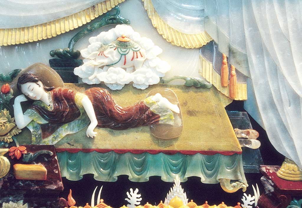 「因果經」記載:當善慧菩薩從兜率天宮降生母胎時,摩耶夫人於眠寤之際,見菩薩乘六牙白象騰空而來,從右脅入,夫人頓覺體安欣樂,如服甘露,即懷娠。