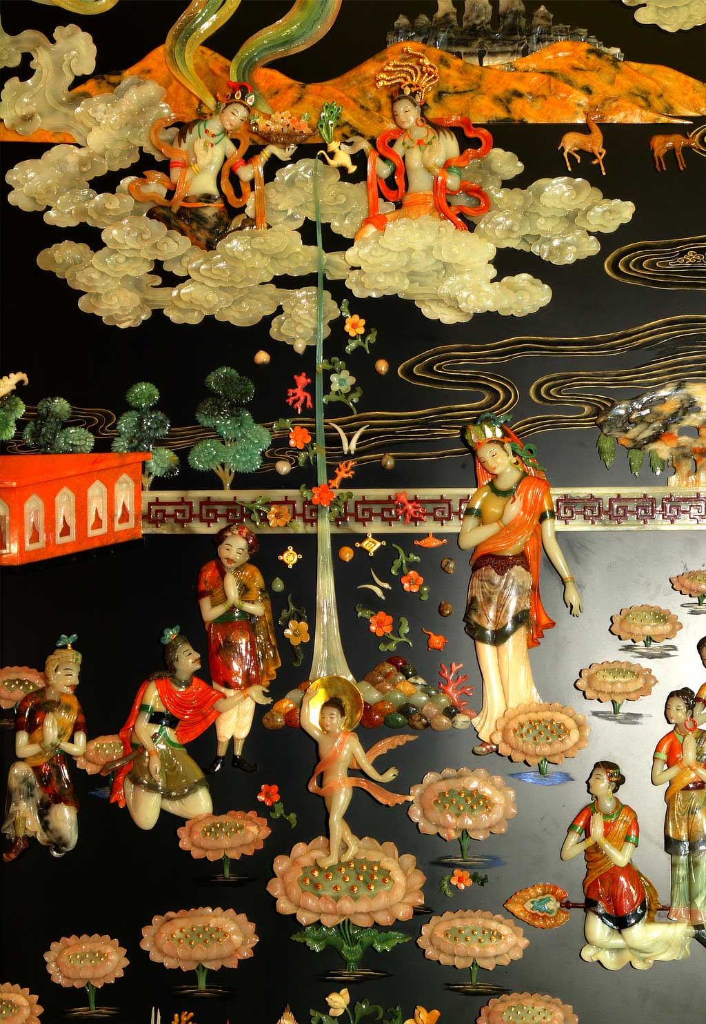 心中生起神桌上盛滿佳餚、鮮花,宴請佛陀與十三地菩薩。神桌之下,天人示以紡織象徵農業興起,因此,桌子底下以紡織機與法輪裝置表示。