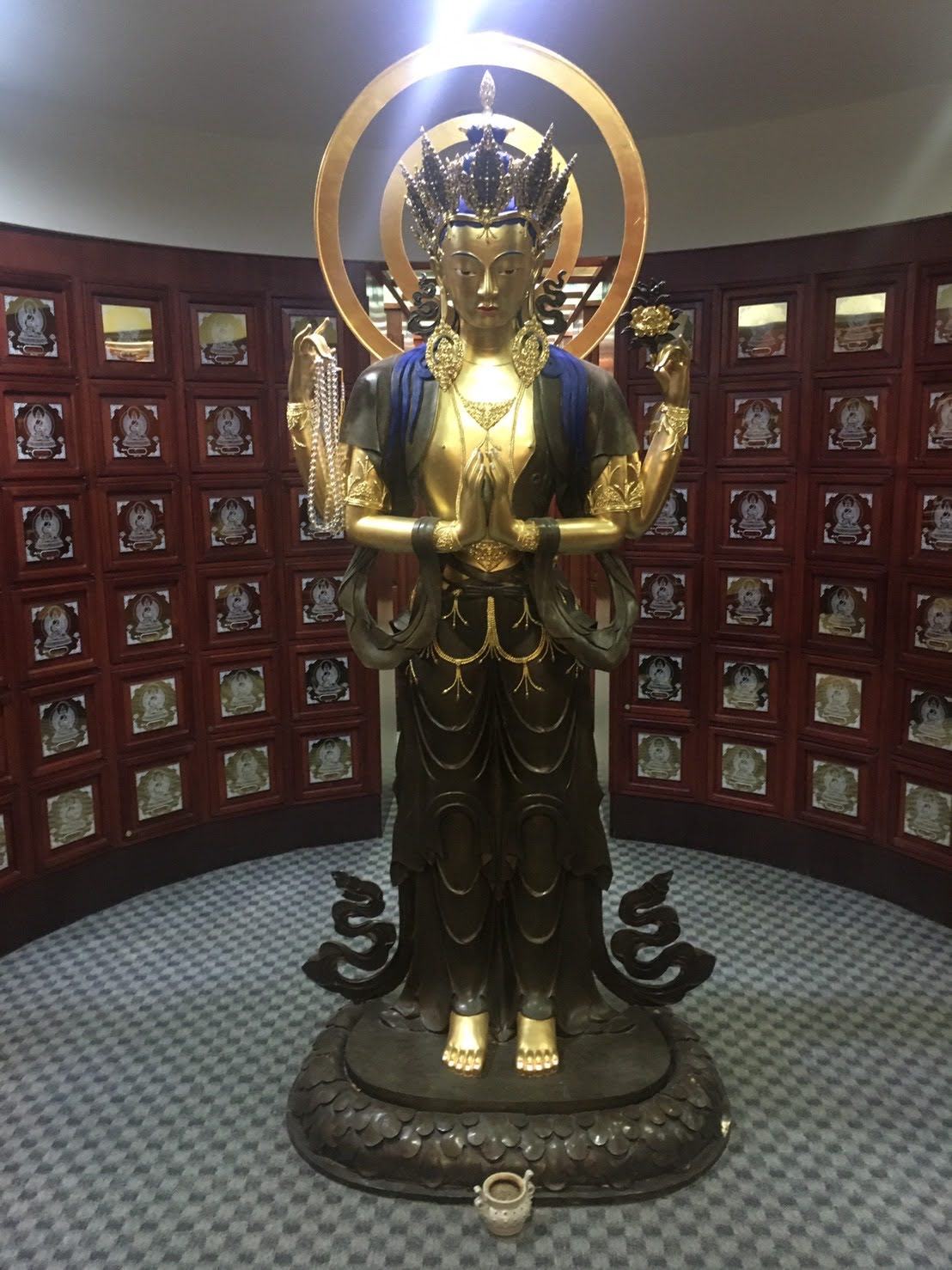 偉哉!怙主觀世音。這一尊觀音聖像,阿坤師在寺雕塑,阿益鑄銅,泥金彩繪郭佳鈴。在多人通力合作下完成,這尊四臂站立觀音,是我極為滿意的佛像之一。現在安奉於舍利塔彌陀世界中,於此何以未安奉阿彌陀佛,而安立觀世音?如經典所說,觀世音於未來際將繼承阿彌陀佛事業,繼續在西方淨土說法度脫淨土菩薩們成佛。為令我等菩提心廣大深遠,悉發願於觀音尊前成就佛果。