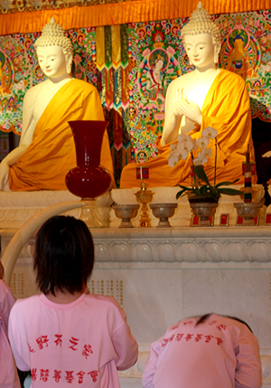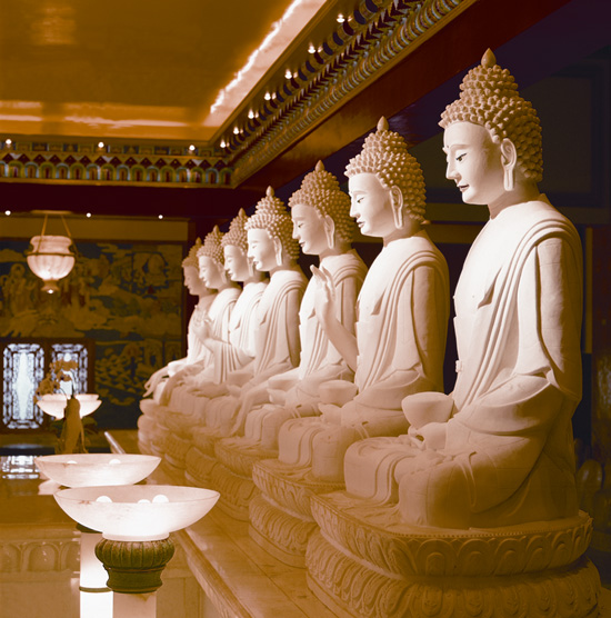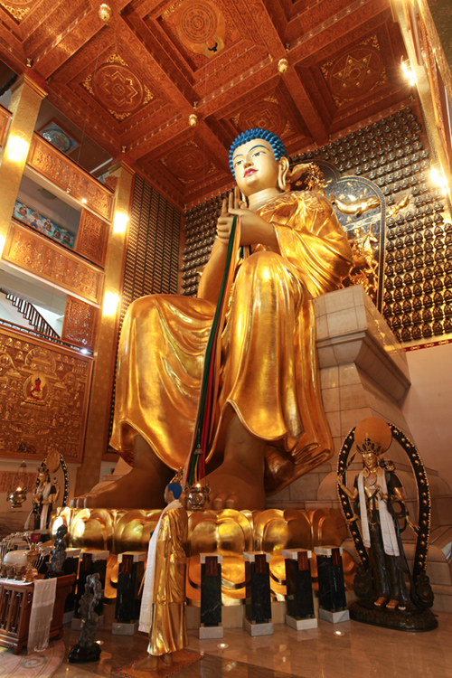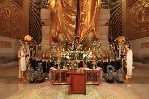 脅侍比丘、菩薩 在大佛金剛寶座之前,兩大弟子舍利弗、目犍連脅侍左右。手執錫杖、僧缽,以「三折姿」而立,活潑的動態感、優美的身段線條,流露年輕的生命力。 外側四臂觀音、文殊,站立蓮臺,以菩薩脅侍大佛左右,隱然詮釋本寺乃「密續觀音文殊壇城意所化現不壞神聖宮殿」的密意。古銅色的典雅高貴,這種造型藝術,在台灣非常罕見而珍貴。 同時,二比丘、二菩薩、一佛的配置,也呼應顯教法華經「聲聞、緣覺、菩薩」三乘會歸一佛乘的真諦。顯密圓融的境界,不立文字,而自然流露。 | |||||||||||||