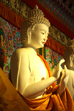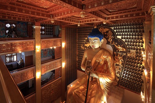 殿內主祀十六公尺高的金銅釋迦牟尼佛說法像,與七佛白玉石雕、藻井九大壇城,並列為本寺藝術三絕。 壁畫、雕塑、彩繪、唐卡,令人驚豔!漢藏兩族傳統工藝,已在此延續且創新;頂禮靜觀,似可瞥見藏於藝術身後的永恆生命。 各樓有其安名:一樓,金剛寶座。二樓,前為「法輪院」,後為「日光樓」。三樓,「講經院」。四樓,「傳燈院」。五樓,「密續院」。六樓,「上樂金剛殿」。