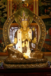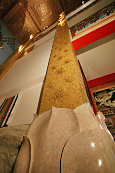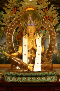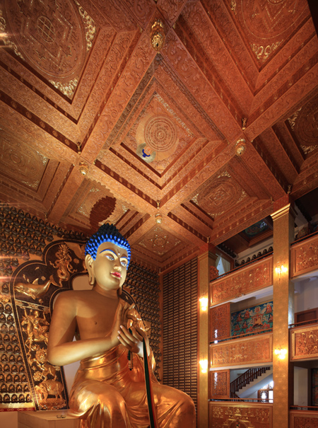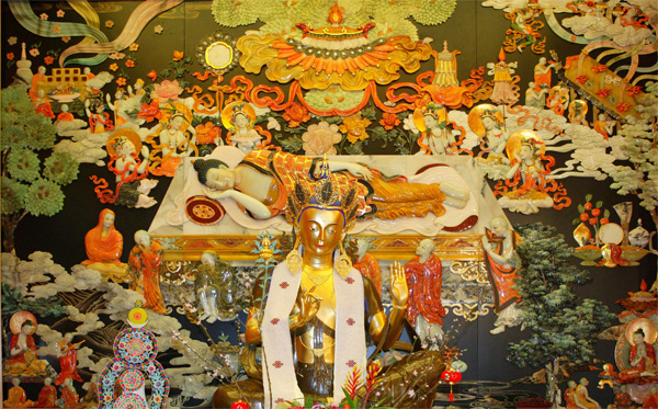 釋迦牟尼示現人間,教導我們如何離苦得樂,究竟成佛。後人集佛陀一生故事,而為十二相成道的精彩佛傳。根據密續之說,釋迦牟尼佛先依顯宗契經,圓滿三大阿僧祇劫,證十地菩薩;在奧明天受十方諸佛無上灌頂,證圓滿果位。爾后以化身示現於人間,為淨飯王之子;在尼連禪河邊入定時,至天道說法六年。此與小乘、大乘之說,有明顯差異。 藝術史上,早在印度桑奇佛塔、犍陀羅石雕,已出現情節簡單的佛傳圖。西元三世紀的秣菟羅,具結構性的「四相成道圖」,描繪了佛陀誕生、成道、說法、涅槃。五世紀以降,「八相成道圖」逐漸定型後,方有十二相成道圖的出現。本寺的佛傳圖,以龍樹菩薩所說經為藍本,西藏畫師將之表現為十幅壁畫,勾勒底圖後,遠赴大陸以玉石鑲嵌而成宏偉巨帙。溫潤典雅的材質,特殊的藝術形式,在流麗的線條堆疊勾連下,流露濃厚的漢家風情。刻畫細膩完備,曲盡其妙,直可謂承襲歷史遺韻,似又超越之! 金銅八大菩薩