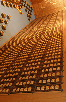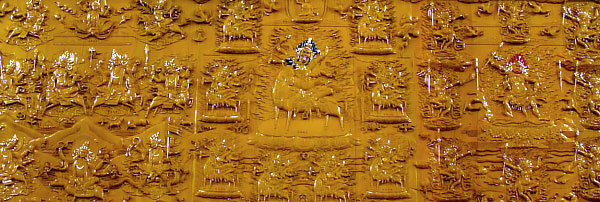 大佛左右壁面,嚴飾滿滿的五方佛銅浮雕。浮雕下銘刻供養者芳名,功德與寺常存。遠溯古代中原石窟,如敦煌、雲岡,經常可見類似的「千佛」主題,只是多以彩繪表現。 佛陀的故事 化為玉石鑲嵌壁畫