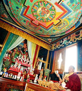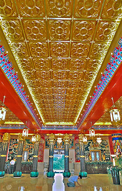 正中央是佛與十六阿羅漢和合僧聚眾輪,意在祈禱藏傳佛教在台灣日益興盛、所有出家眾都能和合。餘八座分別為「金剛亥母壇城」、「上樂金剛壇城」、「紅觀音壇城」、「密集金剛壇城」、「喜金剛壇城」、「文殊降閻魔壇城」、「大幻化網壇城」、「金剛手壇城」。 九座壇城作「井」字形分佈,齊整而深邃,明麗而神秘。本尊居最裡層蓮瓣中,四周以各式捲草紋、瓔珞垂珠等繁複華麗的紋樣為莊嚴,四角有神龍蟠踞,精緻絕倫!此外共有三十六尊大鵬金翅鳥守衛。依傳統,只有受過本尊灌頂,方可瞻禮本尊壇城,戒律甚嚴。故壇城一直被祕密的保存下來,口耳相傳至今。 神秘的符號,是藏密藝術與深邃佛理結合的極致!仰望藻井上九座稀有的木雕壇城,諦觀那如蒼穹霞影的印記,佛說將可獲得無上加持,名為真實不虛、不可思議。