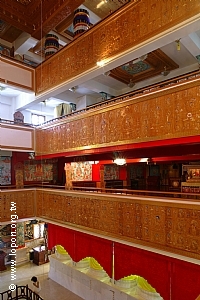 噶瑪寺大佛前方的壁飾木雕,籌畫了整整七年,依序而上三四五樓處,分別為護法、本尊、上師。委請印度札西炯畫師繪製圖稿,然後再由台灣大師級的巨匠雕刻創作,全長7169公分。所謂「諸佛聖眾如雲海會」,儼然如是! 木雕三根本,舉世空前絕妙之作,堪稱藏傳佛教瑰寶。祈請噶居傳承上師、本尊、護法聖眾,恆常守護具信弟子,加持滿溢,普降成就甘霖。 通天柱與萬佛牆