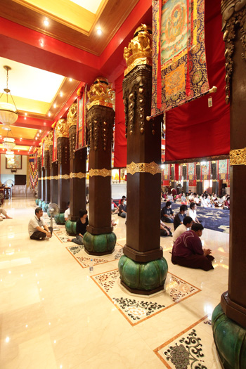 銅柱在佛寺並不多見,噶瑪寺創意羅列十八根曼妙銅柱。柱頂造型三款:有源自印度阿育王柱的四尊獅子,代表四無畏及佛陀威德遠震四方。鐘,象徵名聲遠揚。寶瓶,象徵財富與無量壽。鐘與寶瓶,各有八隻螭龍盤踞,體現漢文化的尊貴和雅。 仁波切云:「興建如來殿之初,年年淹大水,高及大殿石階。一夜,有一漁夫蒞寺問:『何人在此大興土木?做什麼用途?』吾回應:『無毛胡子在此,七佛寓所,小便之用!』彼時雷雨交加,魚肚翻白,十八位如來化現十八金柱,梵宇佛剎充滿瑞氣紫光。醒時,遂為如來殿增填十八銅柱之由來。」 柱身有瓔珞牟尼寶垂飾,並以寶相花(蓮花牡丹結合之團花圖案,常見於中原佛教石窟)連綴四面環腰。昂然聳立的古銅色列柱,鑲上這些精雕細琢的金色紋飾,再以藍綠色反花蓮瓣為柱杵,如是集渾厚與瑰麗於一身,令人驚豔! 一日 仁波切單手扶著銅柱,對弟子說了幾句話,不經意間在銅柱上留下掌印。某弟子不知掌印的來歷,試圖以鋼刷刷洗,卻怎麼刷都刷不掉。不可思議的現象,讓人對 仁波切的修證功德生起敬信之心。 梵文天花板