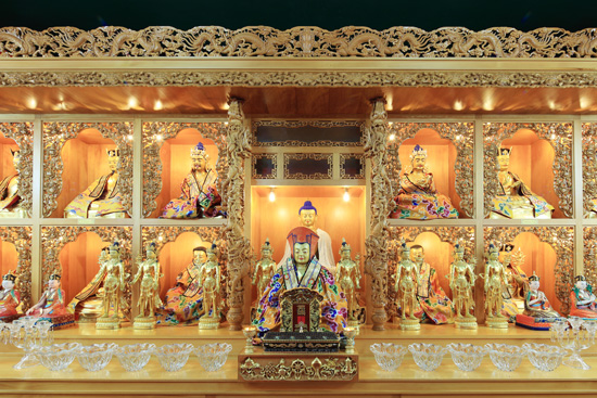第三世噶瑪巴根據他所持有的黑寶冠,複製了一頂紅寶冠,賜予上首弟子札巴辛給,並頒授「夏瑪巴」(Shamarpa)的稱號,表彰這位弟子的卓越證悟與成就與噶瑪巴本人無二無別。夏Sha,「冠」之意;瑪mar,「紅色」之意。「夏瑪巴」意指「紅寶冠的持有者」。 密續院六大本尊 如來殿五樓為密續院,安奉無上瑜珈續六大本尊,依順時針方向為:上樂金剛、喜金剛、二臂紅觀音、金剛亥母、大幻化網、金剛薩埵。六大本尊八尺昂藏,威儀堂皇,其後方為壁畫,描繪本尊的眷屬。除了金剛亥母之外,其餘五尊皆為雙運尊。密續無上瑜珈部乃佛法之精髓,是欲成佛者必修之秘密心法。其雙運示現,是一種方便與智慧的具體呈現。 佛法傳世二千六百餘年,史無前例的本尊開眼法會,於2008年10月6日,恭請尊貴的 鐸康巴法王親臨主持。 仁波切云:「每一尊的開眼,象徵通達每一個本尊的淨土,也意味著清淨一個世界的染垢。如是,六大本尊的開眼,清淨了每一個人六根的染污。今後,登上密續院頂禮,即可清淨六根無始以來所造的惡業,這是多麼殊勝的一件事啊!」