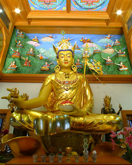 藏傳佛教寺院有一特色,就是佛寺殿堂空間不大,佛像卻很大,有的等身高、或比人高,巍峨莊嚴。漢傳佛教寺院則相反,殿堂空間大,佛像比較小。 蓮師金身的兩側上方,有八尊泥彩金身,是偉大蓮師神通示現,稱為「蓮師八變」。 蓮師聖像兩側,右脅侍為依喜磋嘉佛母、左脅侍為曼達拉娃佛母。如是之「一佛二脅侍菩薩」的佈局,在歷代中原石窟中,一直被延續而成為傳統典型。