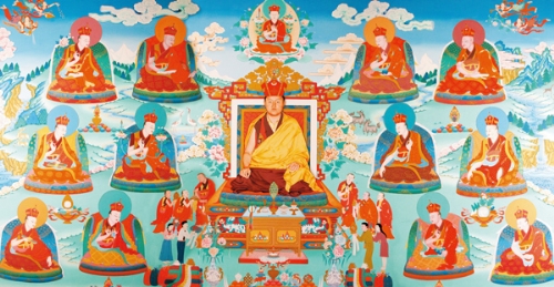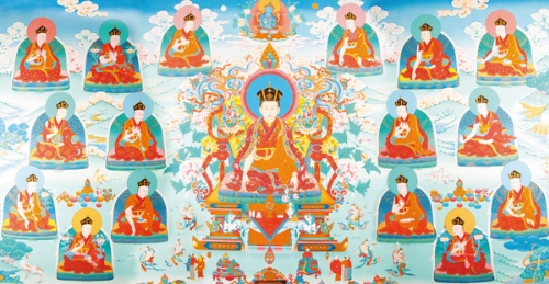八大傳承壁畫 講經院壁畫,以藏傳佛教八大傳承為主題。壁畫敷彩絢爛,正大光明的氣度實震懾心目,具華麗莊嚴之美。 傳燈院