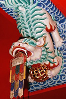 台灣寺廟傳統,戲獅本來就是討喜的吉祥物。承襲本土風情,講經院、傳燈院樑間,也看到許多可愛的戲獅。足戲彩球,流露漢地「南獅」的俏皮;綠鬃雪獅的造型,卻是西藏特有。口啣彩幡,更添祥瑞之氣。